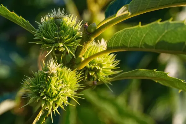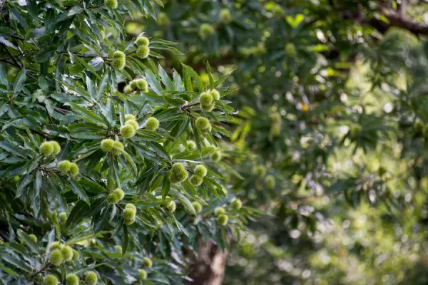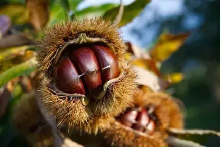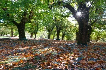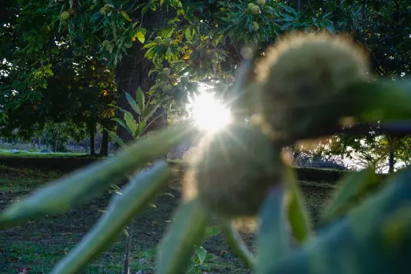 En septembre, le châtaignier devient une étoile scintillante dans la châtaigneraie. Ses fruits mûrissent dans une douce lumière dorée.