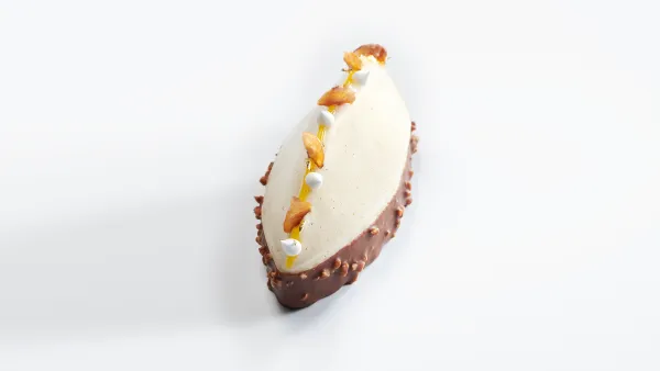 Chablonner le petit montage avec du chocolat au lait, puis le glacer avec le glacage vanille. Pour finir,