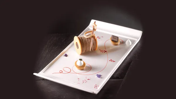 Accoler deux disques de pâte sablée aux extrémités, et représenter le fils de la bobine avec la crème de marrons congelée que vous allez tourner autour.