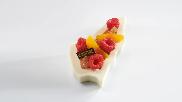 Pocher dans le creux du montage une fine couche de confit d’agrumes, puis dresser les segments d’orange et les framboises.