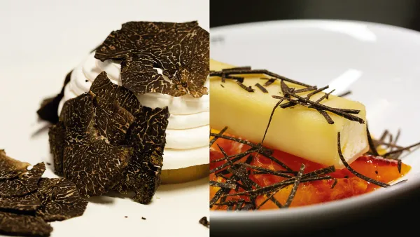 Disposer les suprêmes d’oranges sanguines préalablement mélangés avec la marmelade. Disposer le parfait aux agrumes et finir par une fine julienne de truffe.