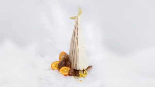 Un Mont-Blanc qui mêle harmonieusement la fraîcheur d’un kumquat acidulé, le moelleux d’un biscuit marron tout tendre et la douceur vanillée glacée.