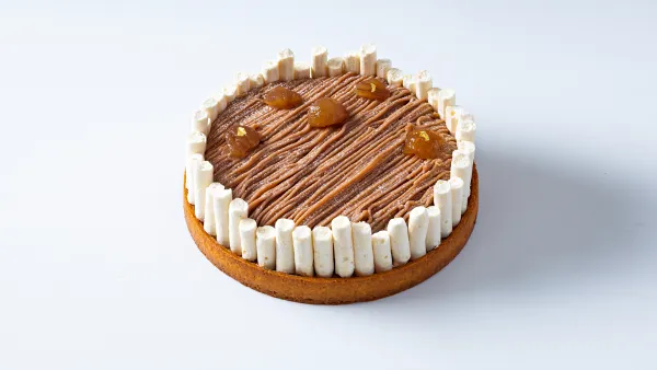 Démouler et placer au centre de la tarte. Pocher en ligne les vermicelles de marrons. Placer autour les bâtonnets de meringue concassés.